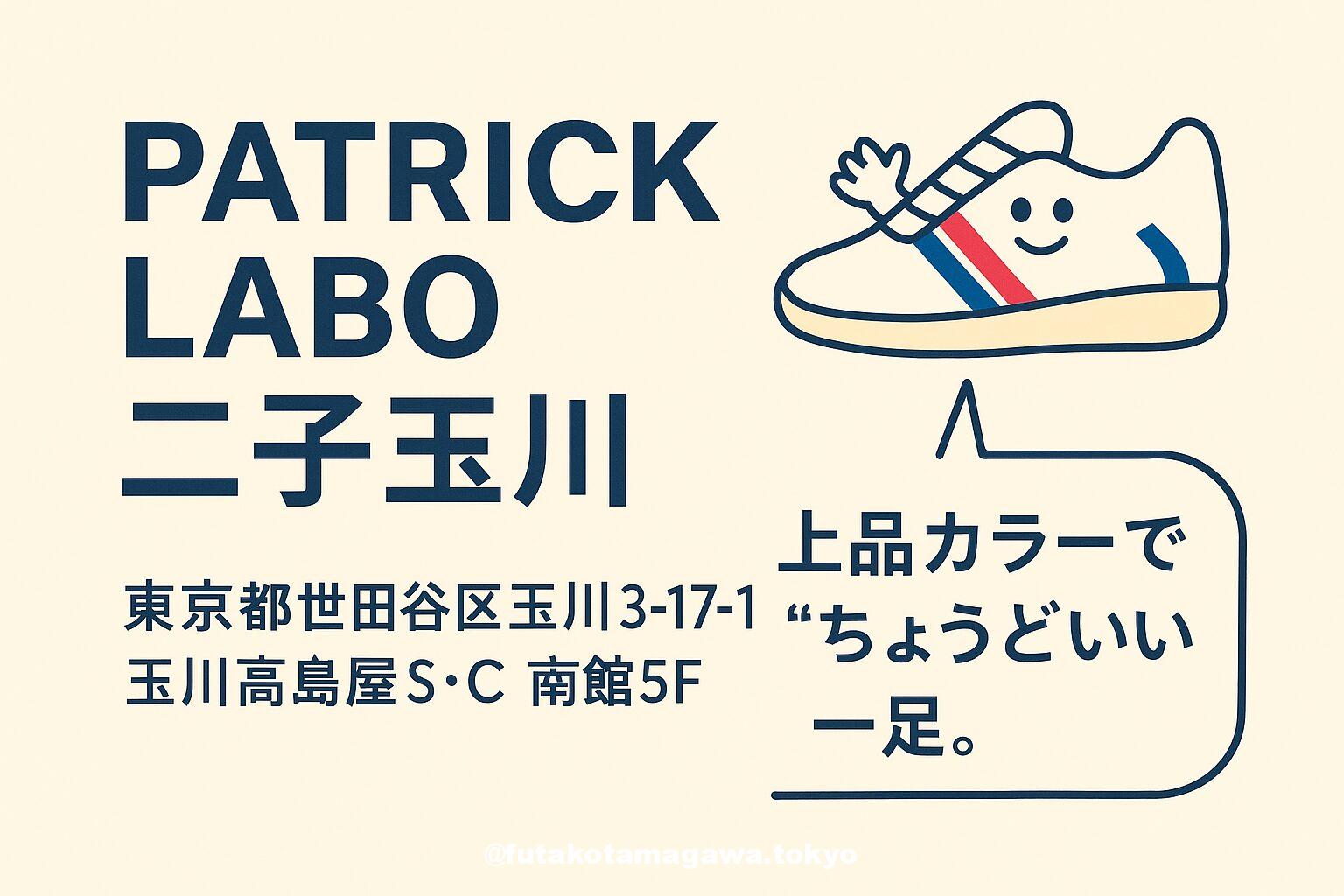 写真 ひとこと紹介文 玉川髙島屋S・C南館5Fの「PATRICK LABO 二子玉川」。日本製にこだわる上質スニーカーを中心に、ビジネス・ゴルフ・キッズまで揃う直営店です。 地図 AI紹介文(ChatGPT5編) フランス発祥、日本製にこだわるスニーカーブランド〈PATRICK〉の直営店「PATRICK LABO 二子玉川」は、玉川髙島屋S・C南館5階に2023年10月オープン。街歩きに映える定番から、季節限定カラー、キッズ、ゴルフ、ビジネスまで幅広いラインアップを一度に試せる“二子玉川のパトリック拠点” ...