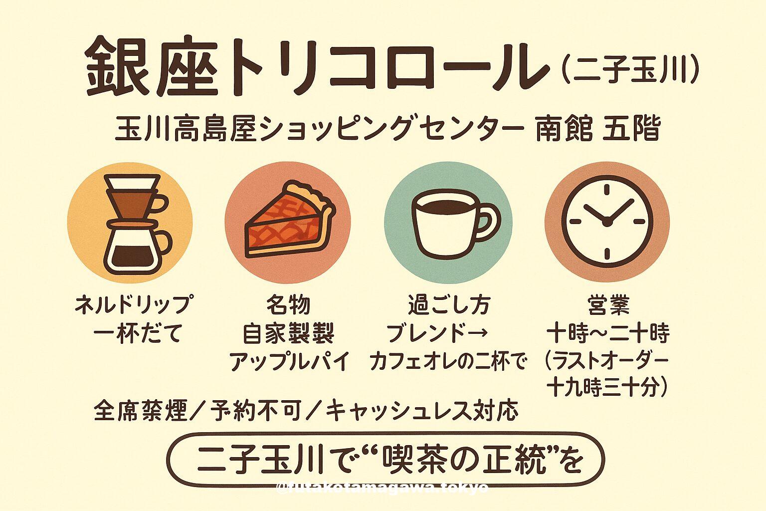 写真 ひとこと紹介文 1936年創業の老舗「銀座トリコロール」。ネルドリップの一杯だてコーヒーと手作りデザートを、玉川髙島屋S・C南館5Fでゆったり。 地図 AI紹介文(ChatGPT5編) 二子玉川の午後は、少しだけ時間の流れがゆるむ。玉川髙島屋S・C南館5Fの「銀座トリコロール」は、1936年の創業から受け継がれてきた“ネルドリップの一杯だて”を今も貫く喫茶店。注文後に豆を挽き、分厚いネルで丁寧に抽出されたコーヒーは、口に含むと角の取れた苦味と艶のある香りがふわりと広がります。ネル特有のまろやかさは、 ...