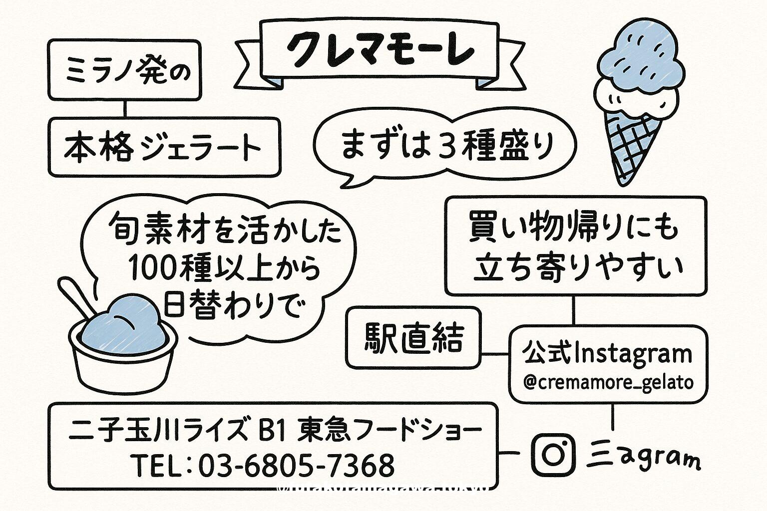 写真 ひとこと紹介文 二子玉川ライズB1「クレマモーレ」は、ミラノ発の本格ジェラート。旬のフルーツや素材を活かした100種以上から日替わりで提供。買い物途中の“ご褒美一口”に最適です。二子玉川ライズ 地図 AI紹介文(ChatGPT5編) 二子玉川で“ちゃんとおいしい”ジェラートを探すなら、東急フードショーB1の「クレマモーレ」へ。イタリア・ミラノのジェラート店から製造ライセンスを取得し、日本で丁寧にフレーバー開発を行うブランドです。果物や野菜などフレッシュな素材を使い、添加に頼らない自然な味わいが身上。 ...