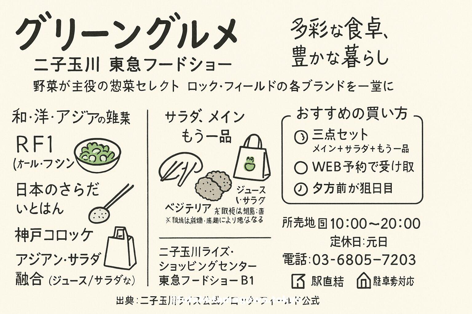 写真 ひとこと紹介文 二子玉川ライズB1「グリーン・グルメ」は、RF1が手がける惣菜セレクト。和・洋・アジアの多彩なサラダ&おかずで、今日の食卓を“手軽に上質”に。二子玉川ライズrockfield.co.jp 地図 AI紹介文(ChatGPT5編) 二子玉川で“ちゃんとおいしい惣菜”を選ぶなら、二子玉川ライズ・ショッピングセンターB1の東急フードショー内にある「グリーン・グルメ」へ。ここはロック・フィールドが展開する惣菜ブランドから、サラダを中心とした人気商品を一堂に揃えるセレクトショップ。RF1のサラダ ...