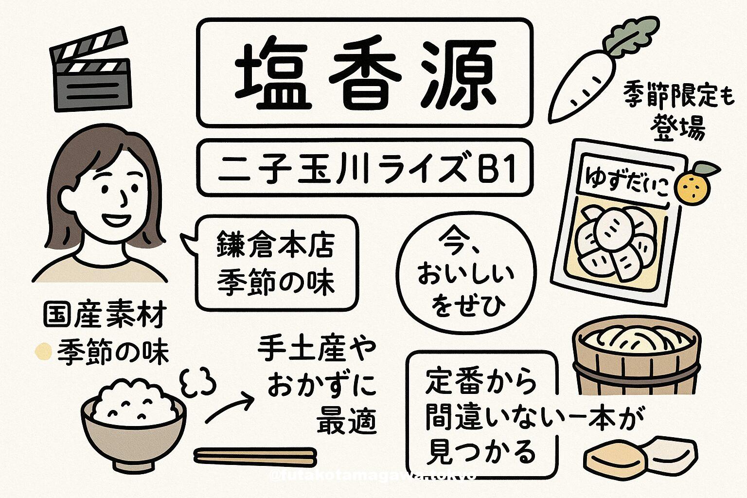 写真 ひとこと紹介文 二子玉川ライズB1「塩香源」は、鎌倉本店の漬物専門店。国産素材と季節の味にこだわり、日常のご飯から贈答まで“間違いない一本”が見つかります。二子玉川ライズ 地図 AI紹介文(ChatGPT5編) 「今日は白いご飯を主役にしたい」——そんな日に頼れるのが、二子玉川ライズ・ショッピングセンターB1の東急フードショーにある「塩香源(二子玉川東急フードショー店)」。鎌倉に本店を構える漬物専門店で、国産原料と旬の味にこだわった手づくりの漬物を揃えます。季節限定品も用意され、店頭に立つだけで“今 ...
