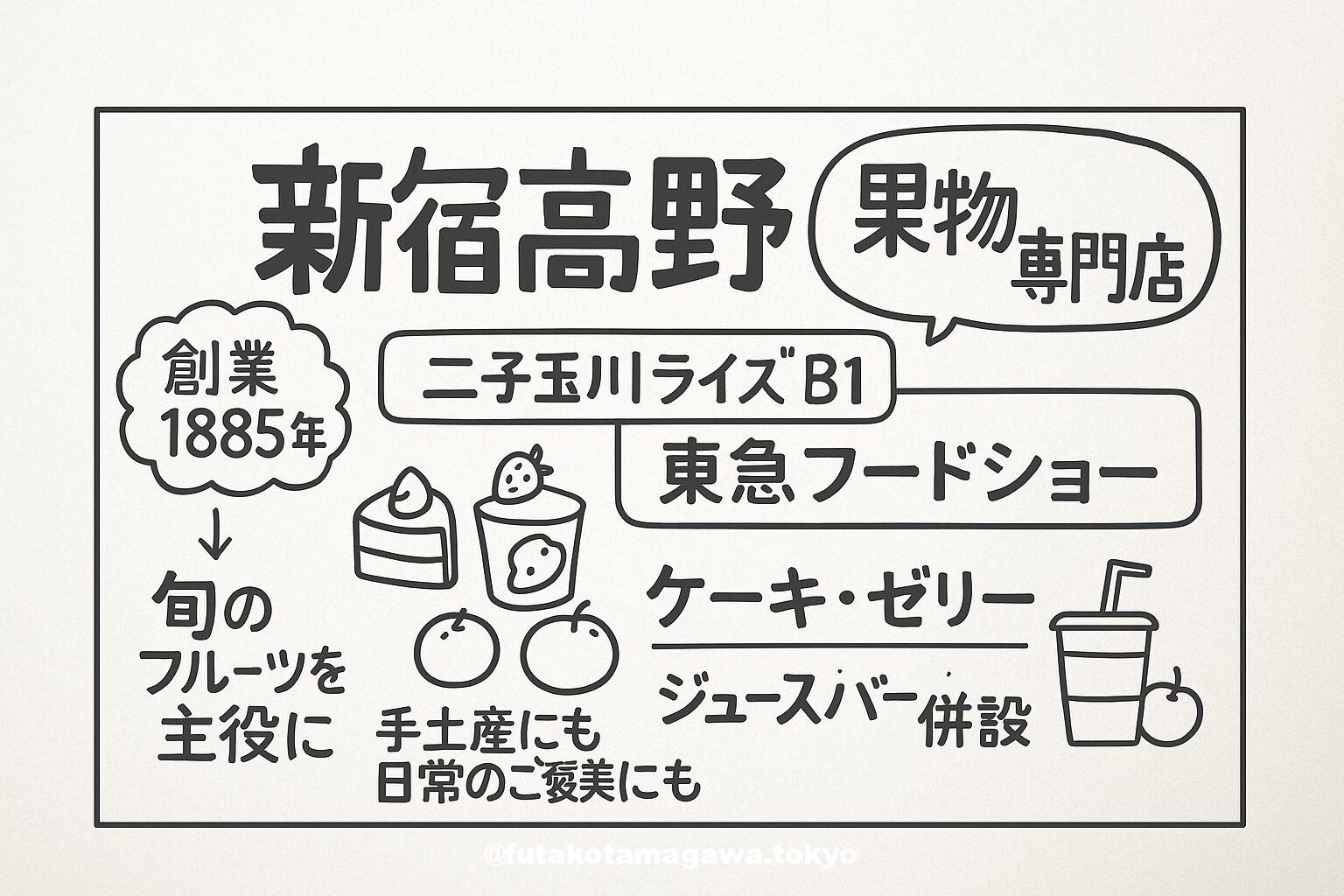 写真 ひとこと紹介文 二子玉川ライズB1「新宿高野」は1885年創業の老舗フルーツ専門店。旬果のケーキやゼリー、ジュースバーまで揃い、手土産にも日常のご褒美にも最適。 二子玉川ライズtakano.jp 地図 AI紹介文(ChatGPT5編) 二子玉川駅直結の二子玉川ライズ・ショッピングセンターB1、東急フードショー内にある「新宿高野 二子玉川東急フードショー店」。営業時間は10:00〜20:00、TELは03-6805-7154。施設に準じた運営で、天候を気にせず立ち寄れる利便性が魅力です。 二子玉川ライ ...