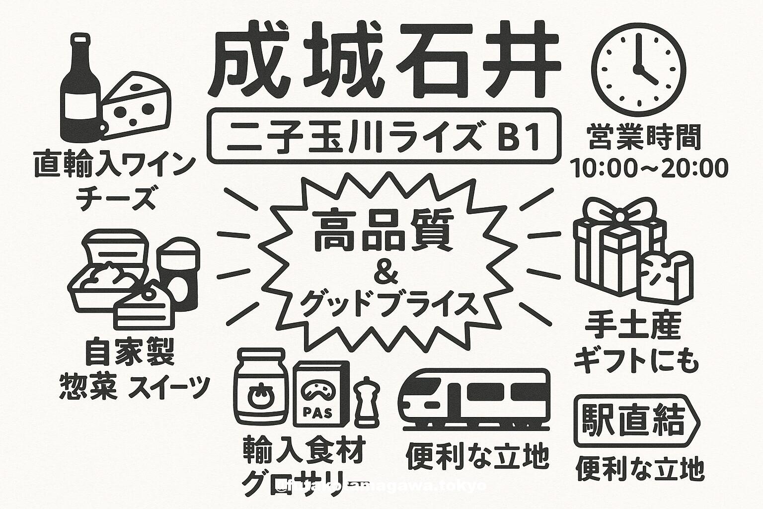 写真 ひとこと紹介文 二子玉川ライズB1「成城石井」。直輸入ワインやチーズ、自家製惣菜が揃う“毎日通いたくなる”高品質スーパー。仕事帰りのご褒美買いにも最適。 地図 AI紹介文(ChatGPT5編) 二子玉川駅直結の「二子玉川ライズ・ショッピングセンター」地下1階、ザ・グルメパントリーゾーンに構える〈成城石井 二子玉川東急フードショー店〉。営業時間は10:00〜20:00、電話は03-6805-7273。買い回りしやすいフロアにあり、日々の食卓から贈り物まで“ここ一軒で決まる”使い勝手が魅力です。二子玉川 ...