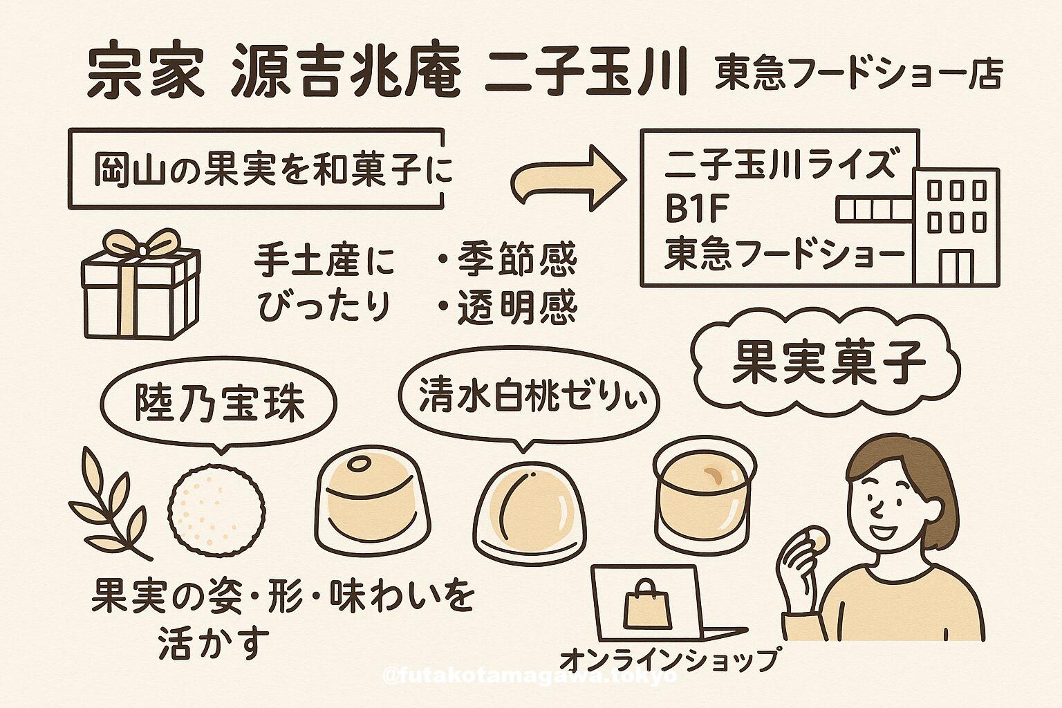 写真 ひとこと紹介文 果実の香りと透明感をそのまま菓子に——岡山発「宗家 源吉兆庵」二子玉川店。陸乃宝珠や清水白桃ぜりぃなど、季節の果実菓子が手土産にも喜ばれる一軒。 地図 AI紹介文(ChatGPT5編) 二子玉川ライズB1・東急フードショーに店を構える「宗家 源吉兆庵」は、果実の姿・形・味わいをいかした“果実菓子”で知られる和菓子店。営業時間は10:00〜20:00(元日のみ休業)、電話は03-6805-7157。駅直結で寄り道しやすく、贈り物や自家用のおやつ探しに頼れる存在です。二子玉川ライズ この ...