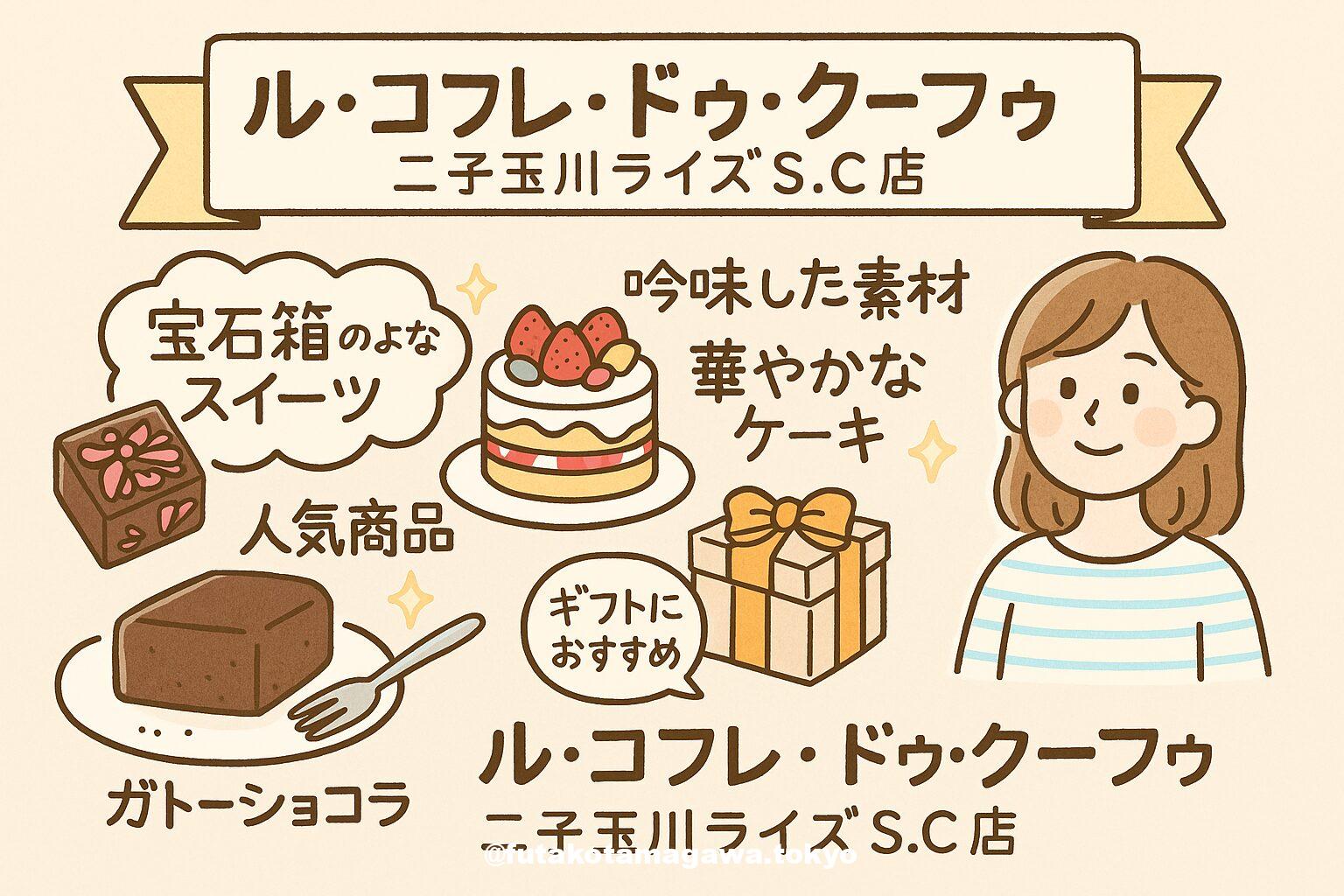 写真 ひとこと紹介文 二子玉川ライズB1〈ル・コフレ・ドゥ・クーフゥ〉。バラの花びらのようなラングドシャやシフォンなど、“心のこもった箱”を贈る上質な洋菓子が揃う手土産の名所。 二子玉川ライズ ブログ https://nikotama.net/%e3%81%94%e8%a4%92%e7%be%8e%e3%82%b1%e3%83%bc%e3%82%ad%e3%81%ab%e3%81%86%e3%81%a3%e3%81%a8%e3%82%8a/ 地図 AI紹介文(ChatGPT5編) 二子玉川駅直結、二子玉川 ...