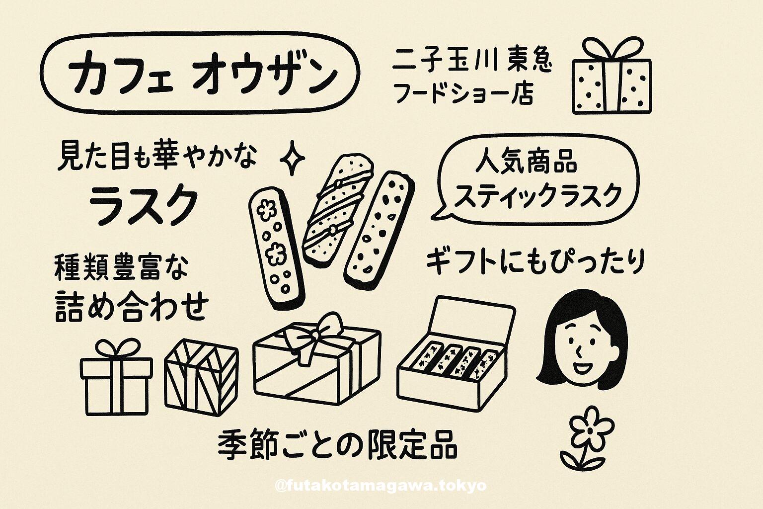 写真 ひとこと紹介文 可愛さあふれる宝石のようなラスクとギフトにぴったりなスイーツを、二子玉川ライズB1・東急フードショーで。手作りの温かみとキラリと光る華やかさが魅力です。 地図 AI紹介文(ChatGPT5編) 二子玉川ライズ・東急フードショー地下1階にある「カフェ オウザン」は、まるで宝石のように輝くスイーツが揃う“ジュエリースイーツショップ”です。1989年創業以来、職人がひとつひとつ丁寧に手作りしたクロワッサンラスクやキューブラスクなど、見た目の美しさと味わいの両立を追求しています。贈る相手の笑 ...