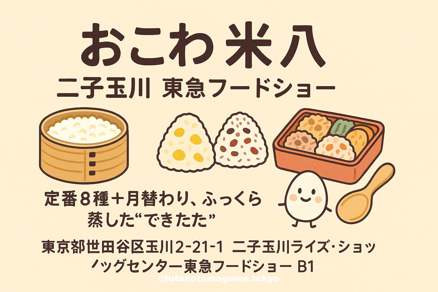 写真 ひとこと紹介文 もっちり蒸したてのおこわ8種と季節弁当が並ぶ「おこわ米八」二子玉川東急フードショー店。駅直結で、旬の味わいを手軽にテイクアウト! 地図 AI紹介文(ChatGPTo3編) “日本の行事食を日常に”──そんな想いから誕生した〈おこわ米八〉は、もち米とうるち米を独自配合し、せいろでじっくり蒸し上げる伝統製法を守り続けるおこわ専門店です。二子玉川東急フードショー地下1階の店舗でも、五目・赤飯・山菜など定番8種に加え、「筍おこわ」「うなぎおこわ」など季節限定品が常時ラインアップ。蒸気の立つ ...