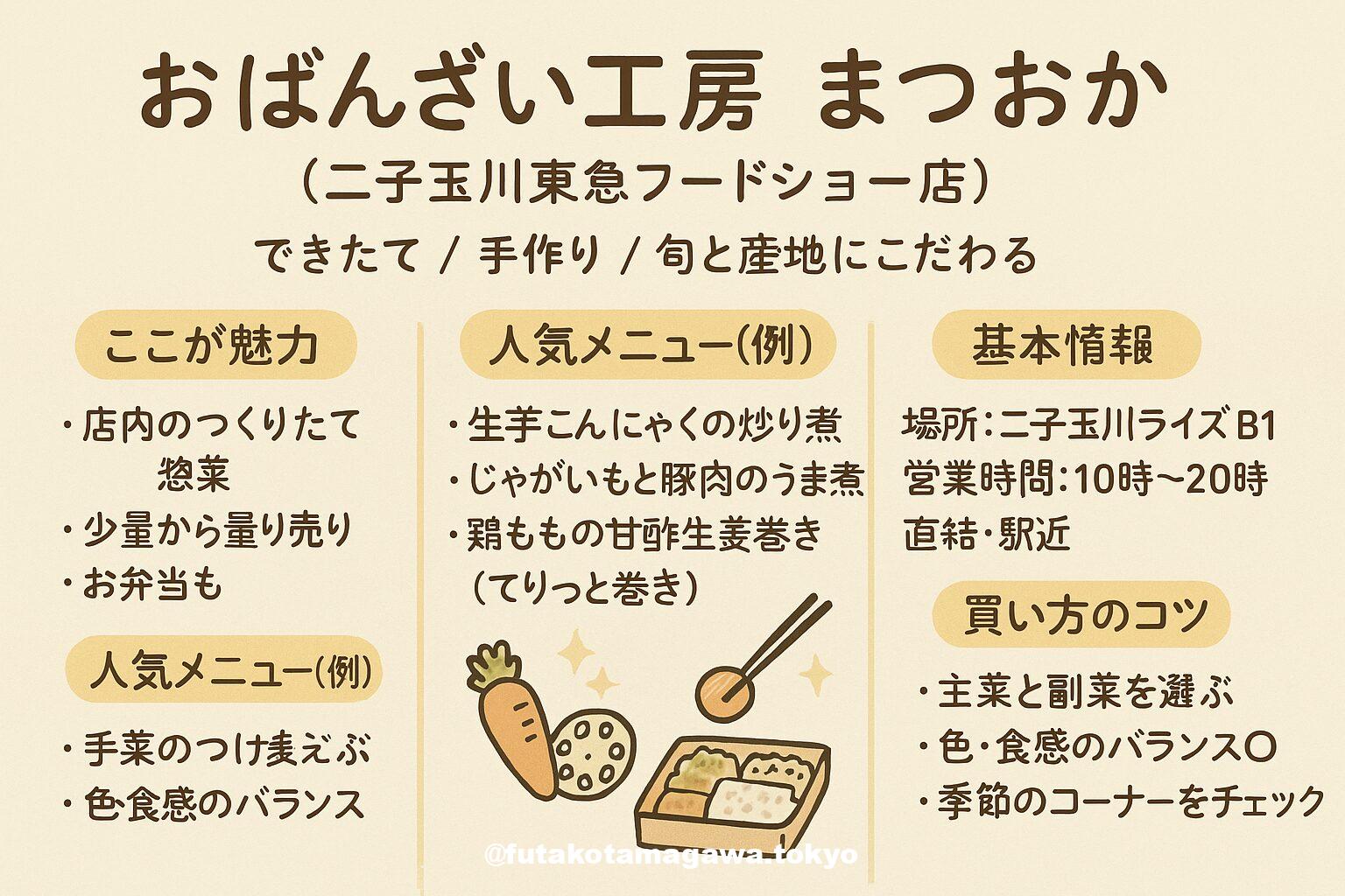 写真 ひとこと紹介文 二子玉川ライズB1「おばんざい工房 まつおか」。名古屋発祥の惣菜店が、店内厨房で作る出来立ての“おふくろの味”を、多彩なおかずとお弁当で届けてくれます。二子玉川ライズ東急百貨店 地図 AI紹介文(ChatGPT5編) 二子玉川駅直結の二子玉川ライズ・ショッピングセンターB1「東急フードショー」にある〈おばんざい工房 まつおか〉は、忙しい日の食卓を頼もしく支える“デパ地下惣菜”の名店。名古屋発祥のブランドで、忘れかけている日本の食文化や旬の味を大切に、店内厨房で手作り・出来立てにこだわ ...