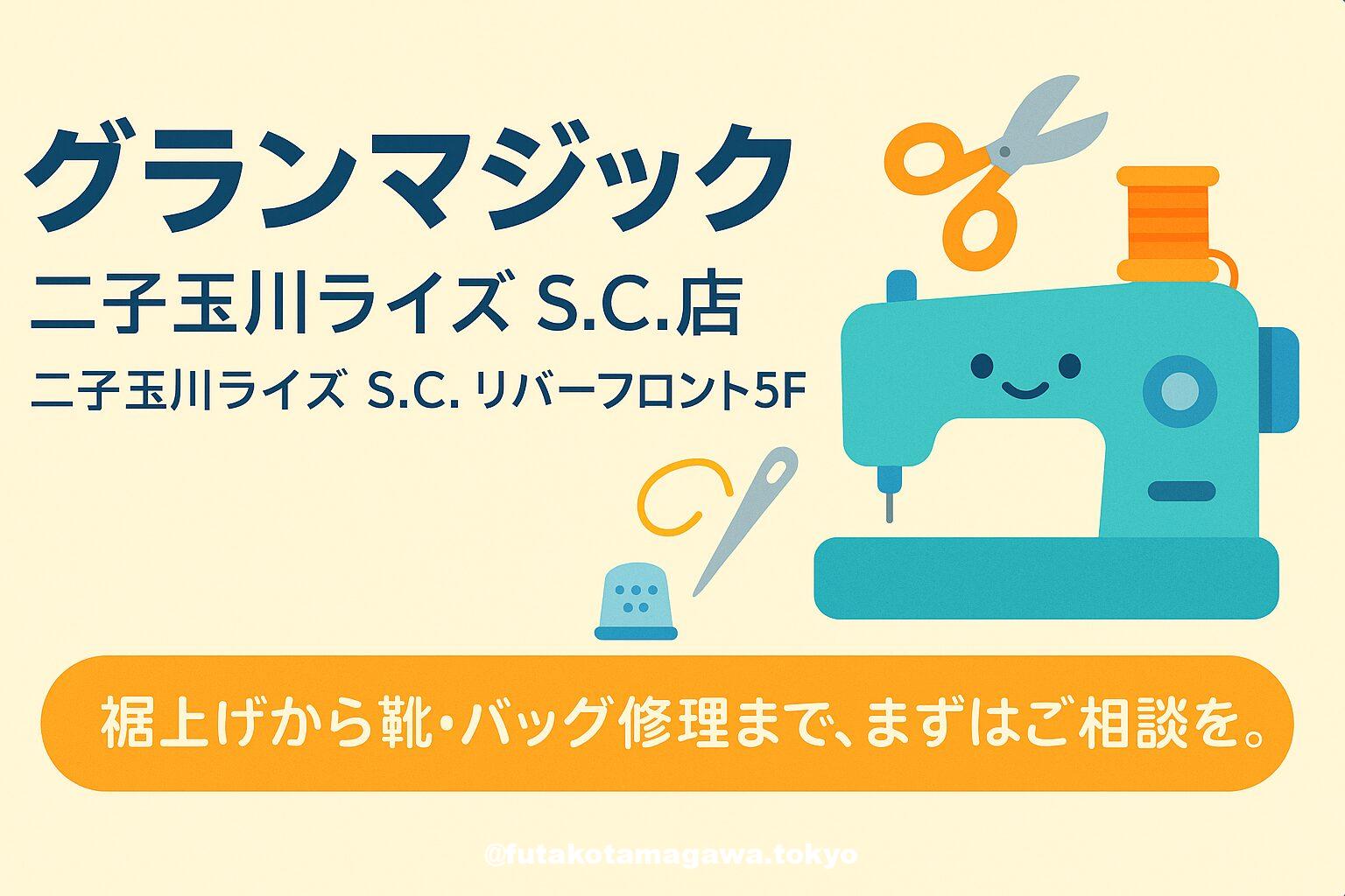 写真 ひとこと紹介文 二子玉川ライズS.C.リバーフロント5Fの「グランマジック」。裾上げから革・靴・バッグ修理、リフォーム&リメイクまで、頼れる“街のお直し”拠点です。 地図 AI紹介文(ChatGPT5編) 二子玉川駅からすぐ、二子玉川ライズ S.C.リバーフロント5Fにある「グランマジック二子玉川ライズ S.C.店」は、洋服のお直しを中心に、靴・バッグの修理や革製品ケア、サイズ調整など“衣類まわりの困りごと”をまるっと相談できるリペア&リメイクの専門店です。買ったばかりのパンツの裾上げはもちろん、コ ...