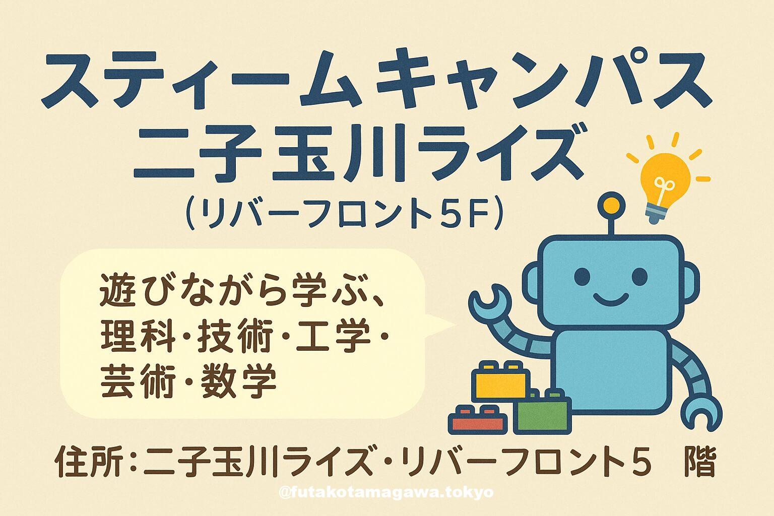 写真 ひとこと紹介文 駅直結・二子玉川ライズS.C.リバーフロント5Fの「STEAM Campus」。レゴ®エデュケーション教材で“遊びながら学ぶ”——2歳〜中学生までの探究心を伸ばす教室です。スティームキャンパス 地図 AI紹介文(ChatGPT5編) 「STEAM Campus二子玉川ライズ S.C.(スティームキャンパス)」は、二子玉川駅直結の二子玉川ライズ・ショッピングセンター〈リバーフロント5F〉にある、子ども向けSTEAM教育の教室です。科学(Science)・技術(Technology)・工 ...