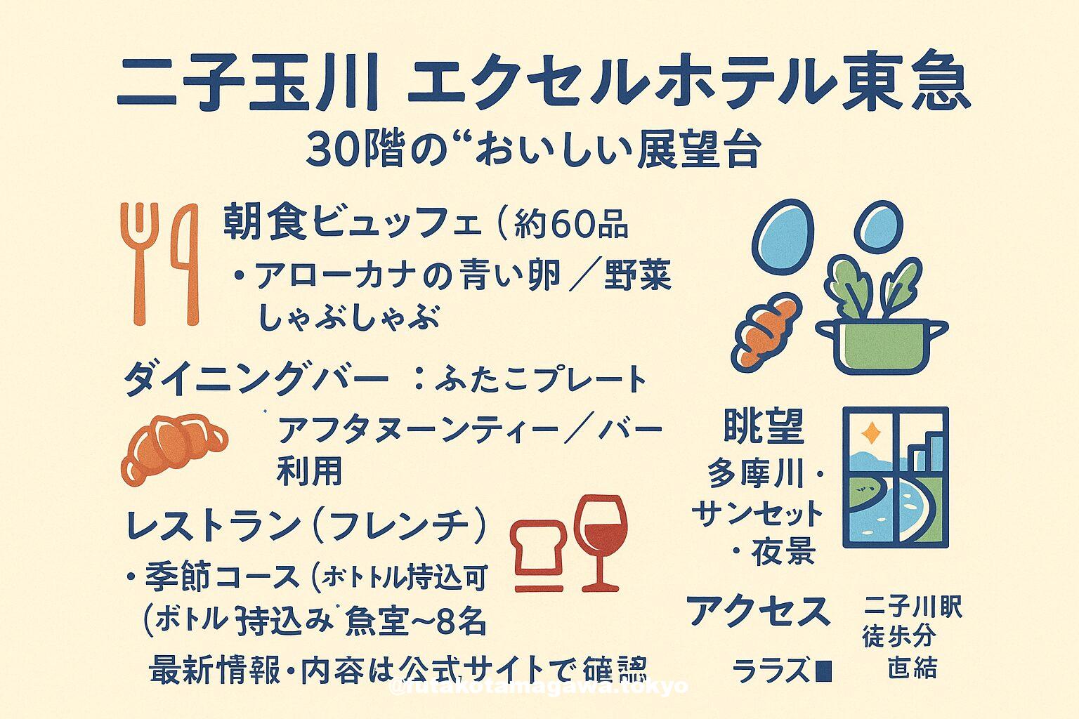 写真 ひとこと紹介文 多摩川ビューの地上30階へ。二子玉川エクセルホテル東急の「The 30th」で、削りたて鰹節や“青い卵”の朝食、季節のフレンチとアフタヌーンティーを堪能。Tokyu Hotels+1 宿泊はこちらから確認してね 地図 AI紹介文(ChatGPT5編) 二子玉川ライズの高層階にある「二子玉川エクセルホテル東急」は、客室もダイニングも28〜30階。眼下に多摩川、晴れた日には富士山まで望む絶景がごちそうです。レストラン&バーは最上階30階。「The 30th Restaurant」では、本 ...