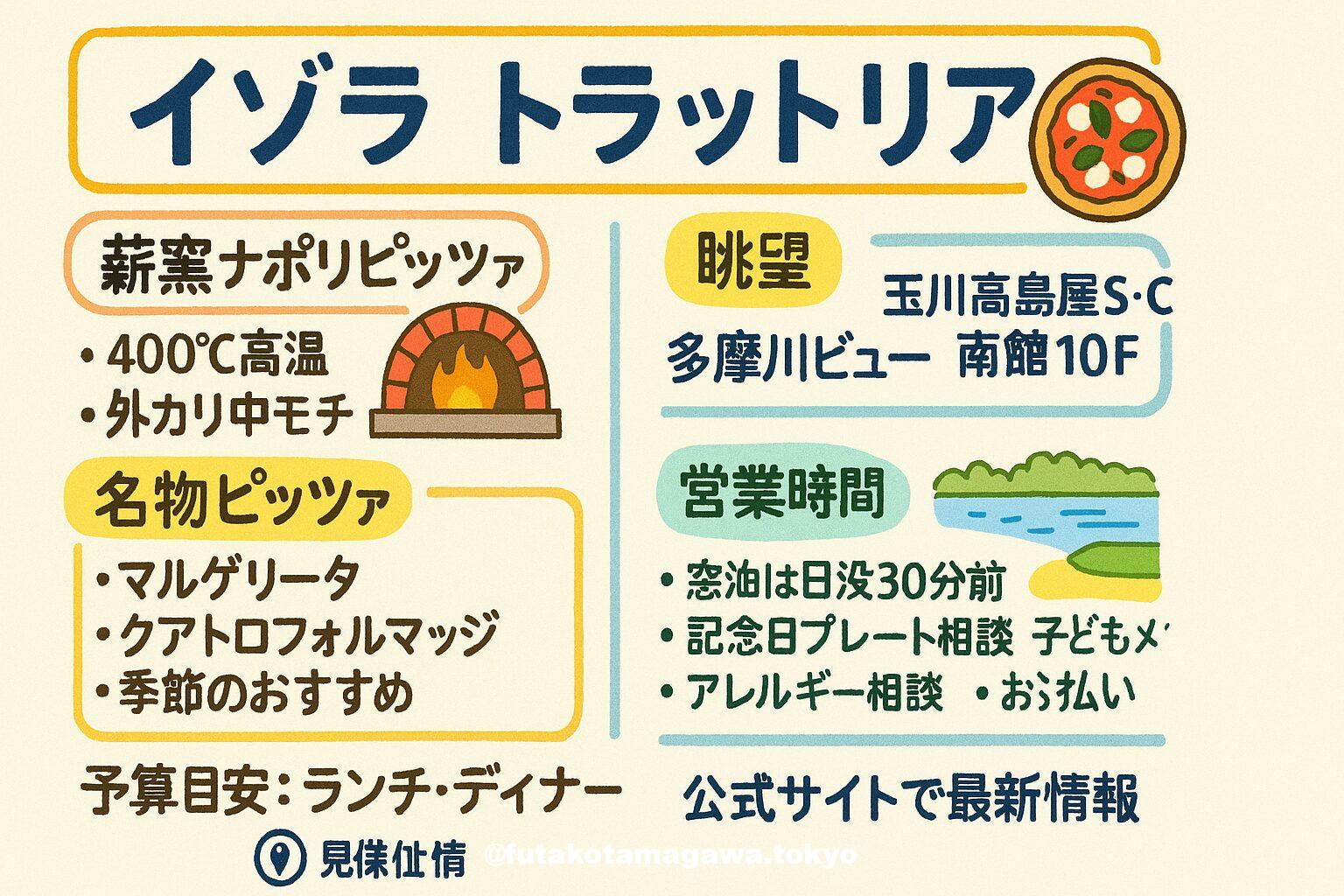 写真 ひとこと紹介文 玉川高島屋S・C南館10F。薪窯で焼く本場ナポリピッツァと季節料理、多摩川を望む眺望が魅力の「イゾラ トラットリア」。家族・記念日にも心地よい一軒。 高島屋+1 地図 AI紹介文(ChatGPT5編) 二子玉川で“ピッツァの香りに誘われる夜”を過ごすなら、玉川高島屋S・C南館10階の「イゾラ トラットリア」。店内中央の薪窯では400℃で一気に焼き上げ、本場さながらの香ばしさと“外カリッ・中モチ”の食感を引き出します。白金の名店「イゾラ」の系譜に連なる一軒で、ナポリピッツァの先駆け的存 ...