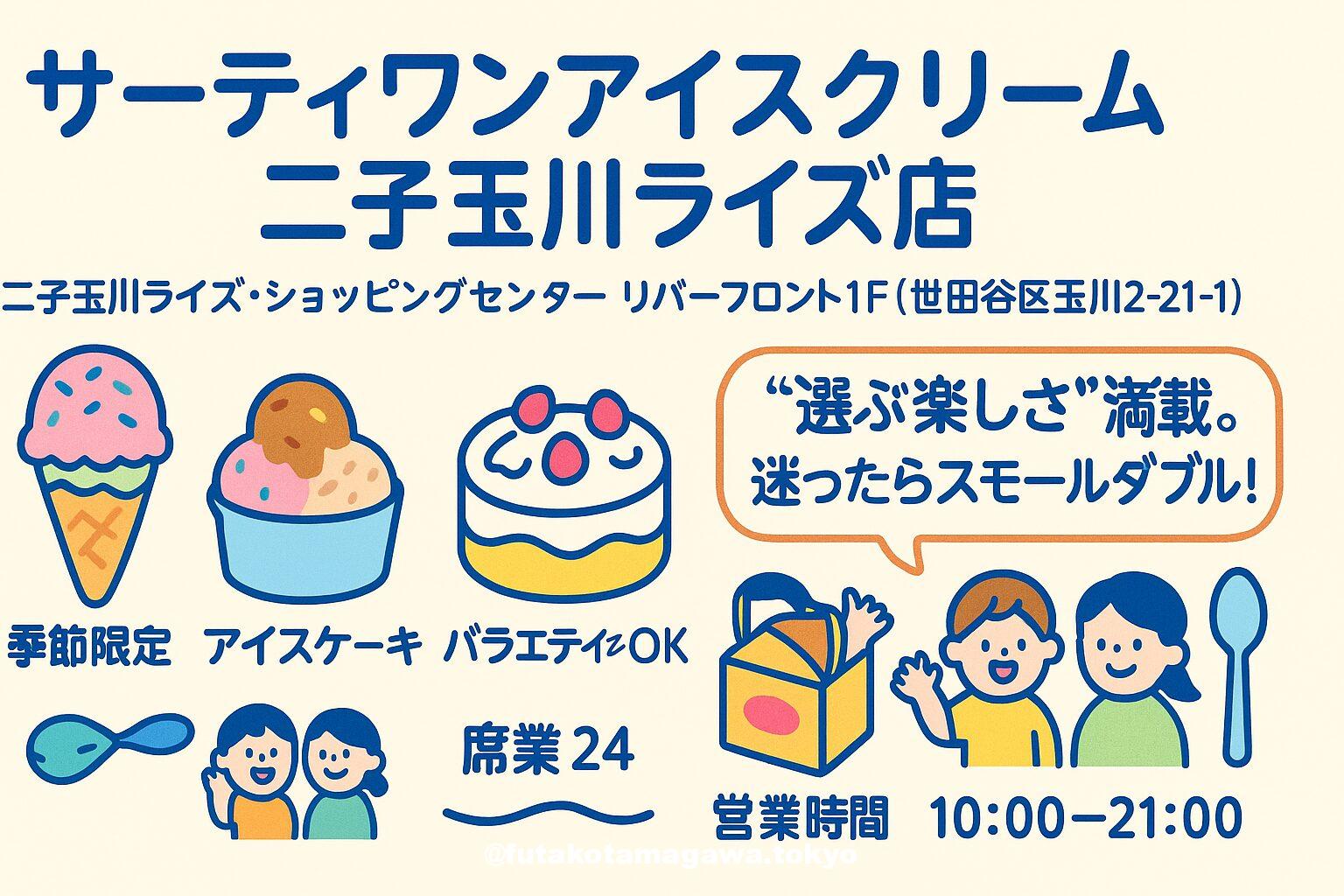 写真 ひとこと紹介文 二子玉川ライズ1Fのサーティワン。季節替わりのフレーバーとアイスケーキ、持ち帰りパックまで“迷う楽しさ”満載。駅近で家族連れにも便利な一軒。 地図 AI紹介文(ChatGPT5編) 二子玉川の甘い気分は、やっぱりサーティワンから。〈サーティワンアイスクリーム 二子玉川ライズ店〉は、二子玉川ライズ・ショッピングセンター「リバーフロント」1Fにある、使い勝手のよい一軒です。営業時間は10:00〜21:00。ショッピングの合間や映画の前後、夕食後の“締めジェラ”にも寄りやすい時間帯がうれし ...