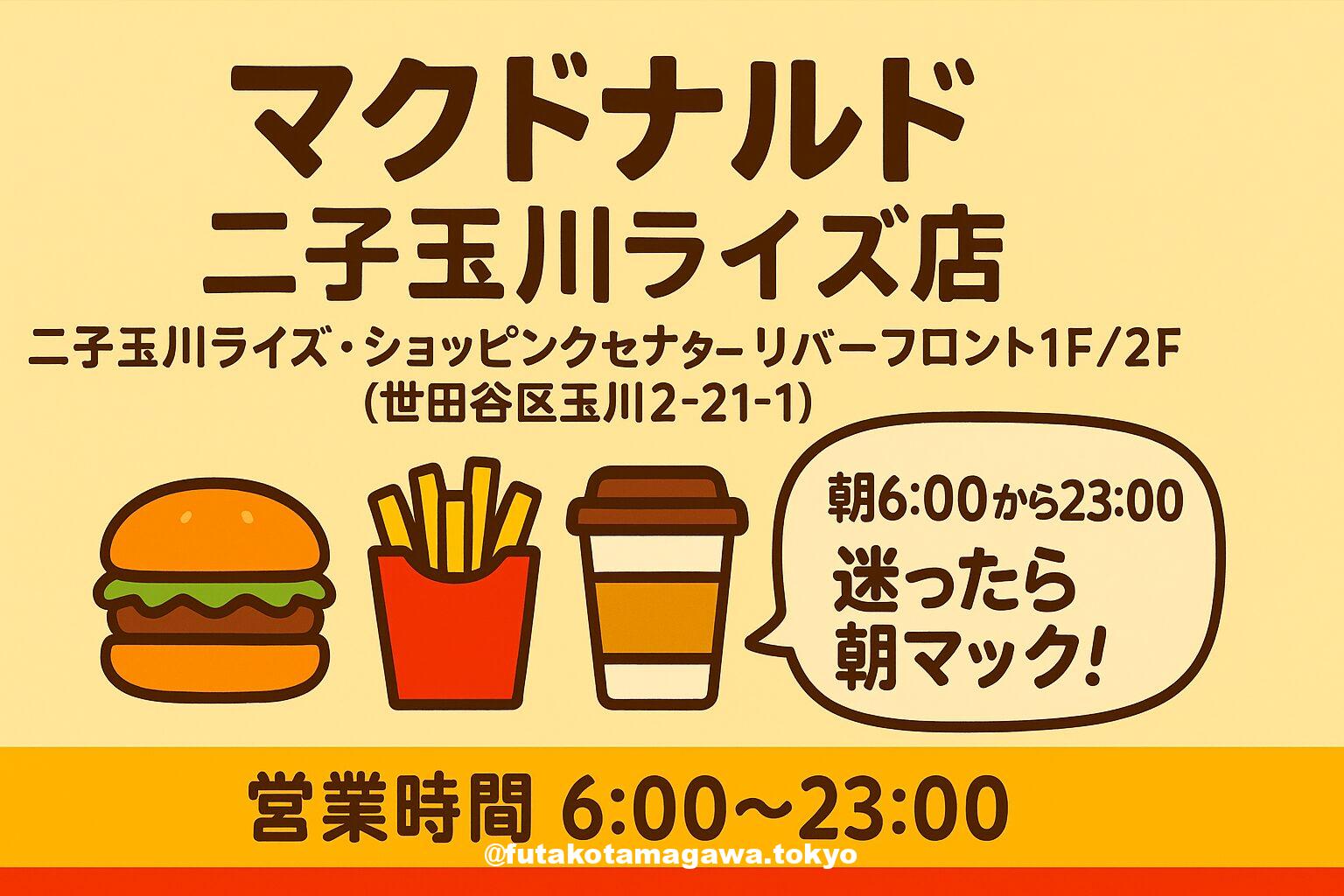 写真 ひとこと紹介文 二子玉川ライズのマクドナルドは、朝6時から23時まで。駅前で使いやすく、朝マックから映画帰りの夜食まで“いつもの一杯”と“定番バーガー”が頼れる一軒。 地図 AI紹介文(ChatGPT5編) 二子玉川で手早く美味しく。〈マクドナルド 二子玉川ライズ店〉は、二子玉川ライズ・ショッピングセンターのリバーフロント1F/2Fにまたがる大型店舗。営業時間は6:00〜23:00で、朝マックにも対応します。駅からの動線がシンプルで、平日・休日ともに使い勝手の良さが魅力です。基本情報は施設公式と店舗 ...