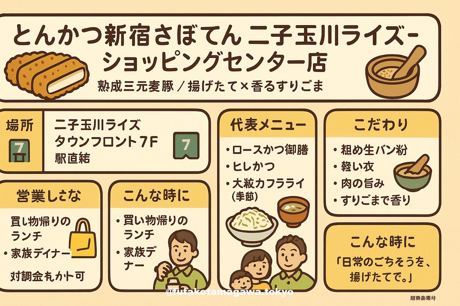 写真 ひとこと紹介文 二子玉川ライズ7F。熟成三元麦豚のロースかつをはじめ、家族で楽しめる御膳が揃う「とんかつ新宿さぼてん」。全46席・子ども椅子あり、テイクアウト可。 地図 AI紹介文(ChatGPT5編) 二子玉川ライズ・タウンフロント7階、買い物帰りの家族やビジネスランチで賑わう一角に「とんかつ新宿さぼてん 二子玉川ライズ・ショッピングセンター店」があります。創業から磨いてきた軽やかな揚げ上がりと、肉の旨みを引き出す火入れ。看板の「熟成三元麦豚ロースかつ御膳」は、脂の甘みと香ばしい衣がバランスよく、 ...