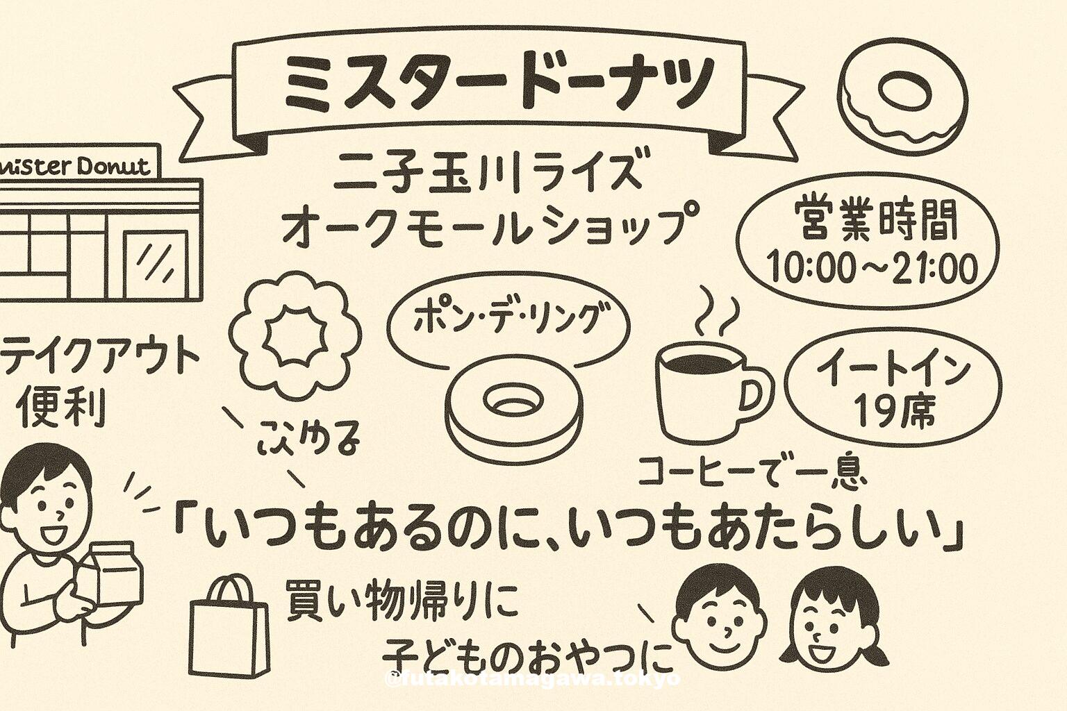写真 ひとこと紹介文 二子玉川ライズ・オークモール1F「ミスタードーナツ」。駅至近で10:00–21:00、イートイン19席・テイクアウト便利。出来たてと季節の限定を“いつもあるのに、いつもあたらしい”一軒で。 二子玉川ライズマピオン 地図 AI紹介文(ChatGPT5編) 二子玉川駅からすぐ、二子玉川ライズ・オークモール1Fにある「ミスタードーナツ 二子玉川ライズオークモールショップ」。営業時間は10:00〜21:00、電話は03-6411-7781。イートインは19席、全席禁煙で、ふらりと立ち寄って一 ...