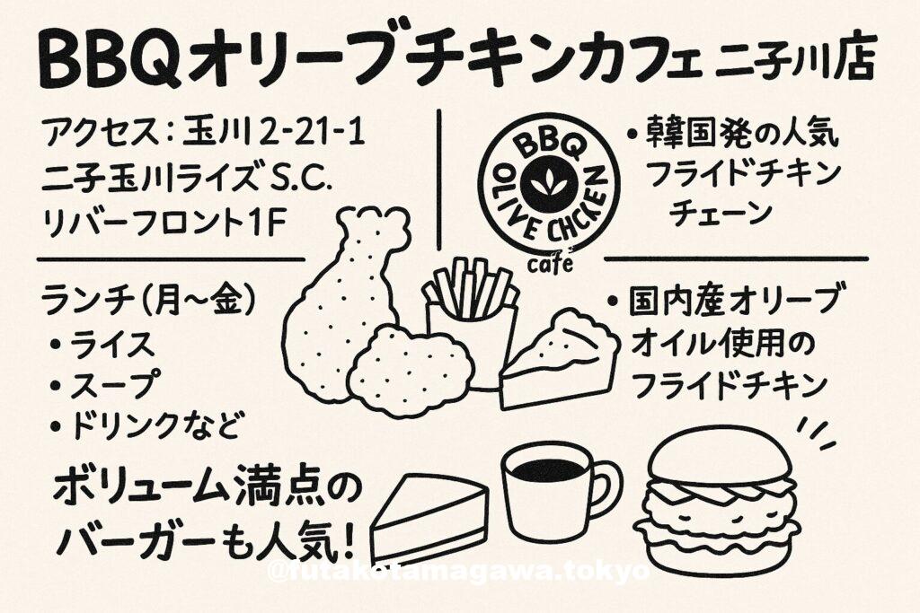 フリーキーワード | bb.qオリーブチキンカフェ二子玉川店は、韓国ドラマでおなじみのフライドチキン専門カフェです。エクストラバージンオリーブオイルで揚げたサクサクのチキンは、ヘルシーながらもジューシーな味わい。カフェスタイルで気軽に楽しめるので、ランチや軽食、ディナーにもぴったりです。 |