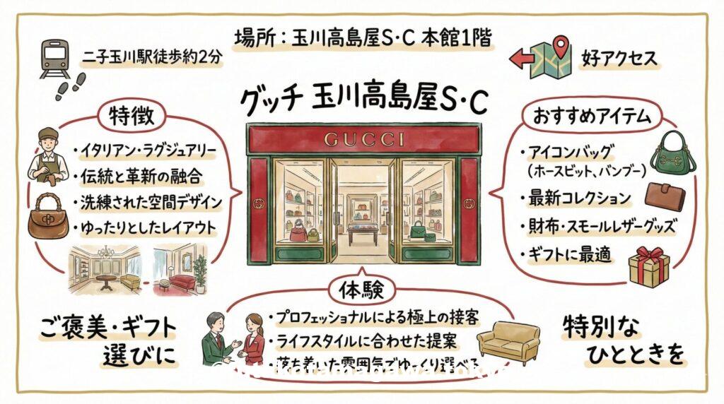 多摩川の豊かな自然と、洗練された都市の魅力が調和する街、二子玉川。その中心的存在である「玉川高島屋S・C」の本館1階に、イタリアを代表するラグジュアリーブランド**「Gucci(グッチ)」**は店舗を構えています。