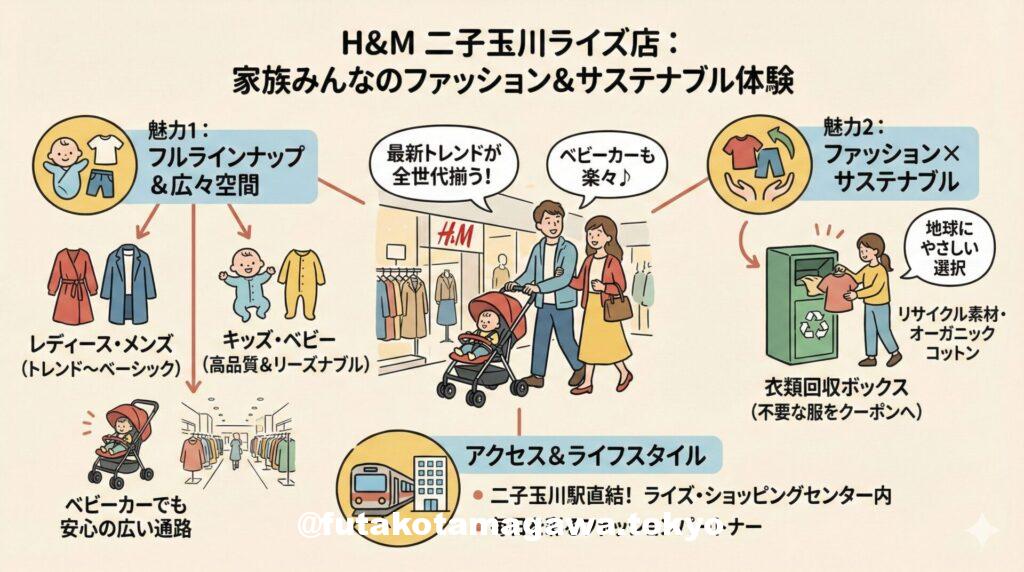 | フリーキーワード | 二子玉川ライズ(リバーフロント1F・2F)のH&Mは、レディス・メンズ・キッズがそろう家族向け大型店。営業時間は10:00〜20:00。会員特典でポイント&クーポンが貯まり、衣料回収プログラムも活用できます。駅直結で寄り道しやすく、ベーシックから最新トレンドまで“今日欲しい”が見つかる便利な一店です。 |