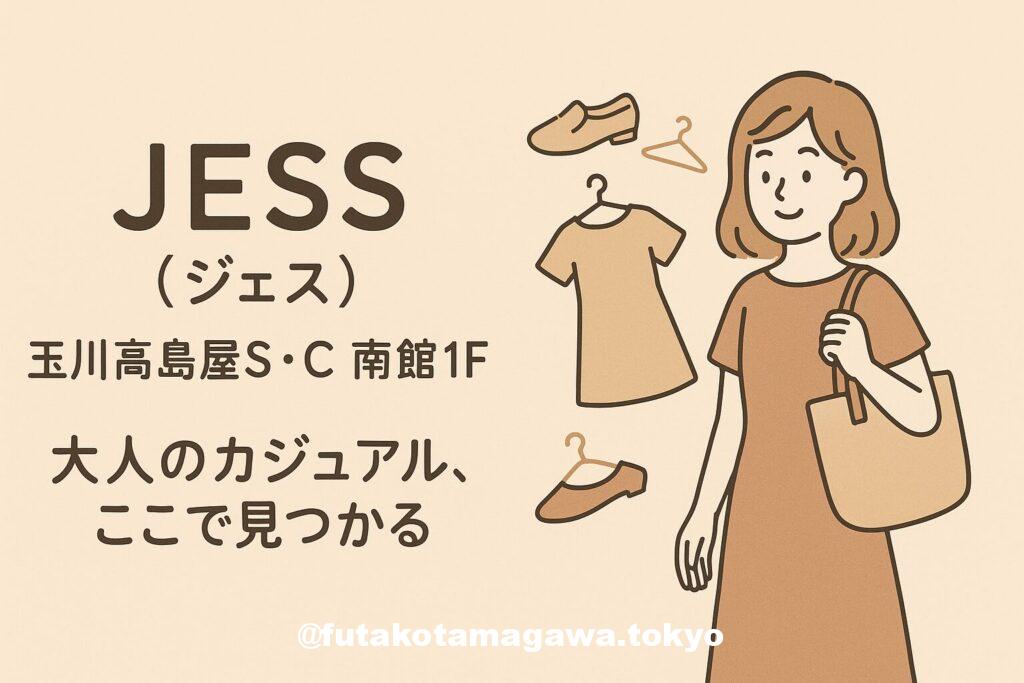 | フリーキーワード | 二子玉川の玉川髙島屋S•Cに佇む「JESS」は、本物を知る大人の女性のための隠れ家的セレクトショップです。フランスの「NO NAME」やイタリアの「TRANSIT」など、着心地とデザイン性を兼ね備えたインポートアイテムを厳選。トレンドに左右されない上質なデイリーカジュアルを提案しており、スタッフの親身な提案とともに、長く愛用できる「私だけのスタイル」が見つかる特別な空間です。 |