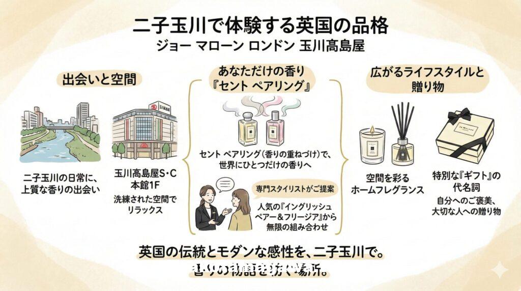 多摩川の豊かな自然と、都会的なセンスが調和する街、二子玉川。 ショッピングや散策の合間に、ふと心が華やぐような香りとの出会いはいかがでしょうか。玉川髙島屋S・C 本館1階に位置する**「Jo Malone London(ジョー マローン ロンドン) 玉川髙島屋」**は、英国の伝統とモダンな感性が息づくライフスタイルブランドのブティックです。