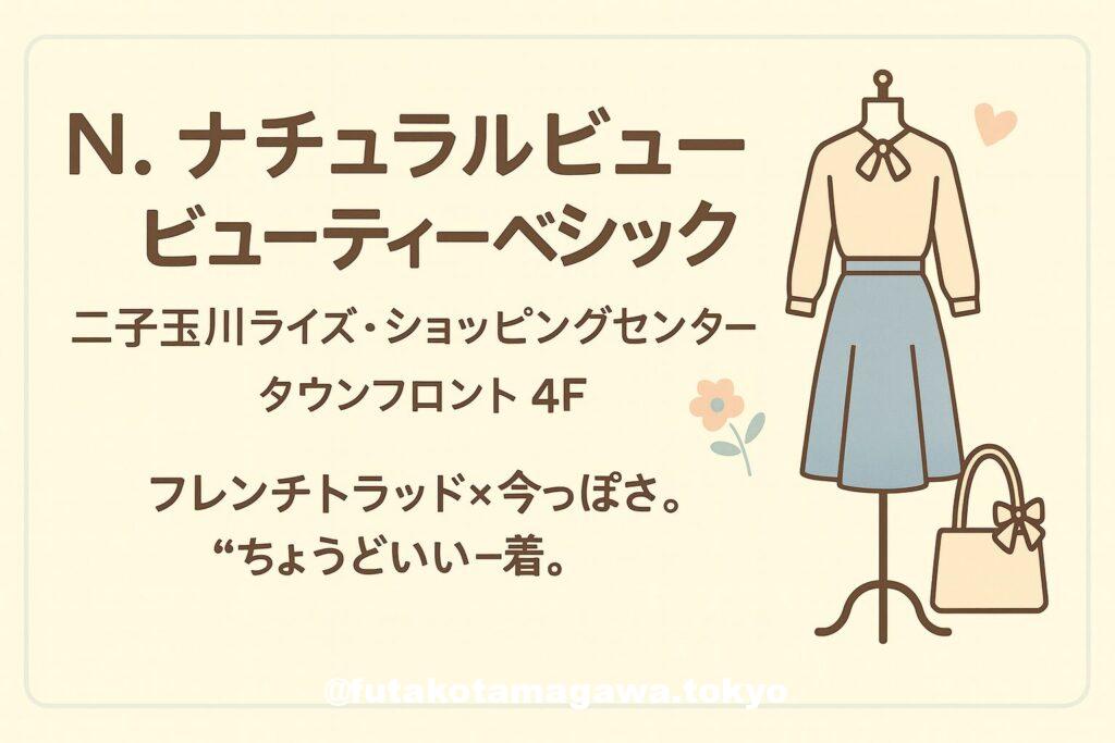 | フリーキーワード | 二子玉川ライズ4Fの「N. ナチュラルビューティーベーシック」は、フレンチトラッドに今の空気をのせた“ちょうどいい”日常服が揃う店。オフィス対応のセットアップから週末のきれいめカジュアルまで、迷わず選べるラインアップと見やすい店内で、今日の正解コーデに最短到達。 |