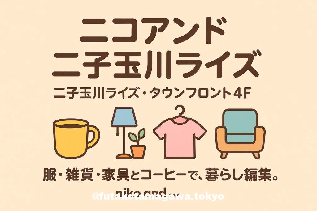 | フリーキーワード | niko and ..., ニコアンド, 二子玉川ライズ, タウンフロント4F, 二子玉川, アパレル, 雑貨, 家具, インテリア, カフェ, niko and ... COFFEE, 駅直結, 10:00–20:00, 世田谷, 便利, 生活雑貨, ギフト, コーデ, ベーシック, トレンド, シンプル, 機能素材, 家時間, 週末, おでかけ, EC, and ST, ブランドサイト, 施設公式, 電話03-5716-3027。 |