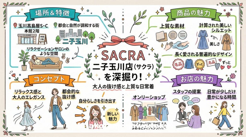 休日のショッピングや、仕事帰りのちょっとしたご褒美に。玉川高島屋S・Cを訪れた際は、ぜひ本館2階のSACRAへ足を運んでみてください。上質で心地よい服たちが、あなたの新しい魅力を引き出すお手伝いをしてくれます。二子玉川で上質なレディースファッションを探すなら、絶対に外せないおすすめのスポットです。