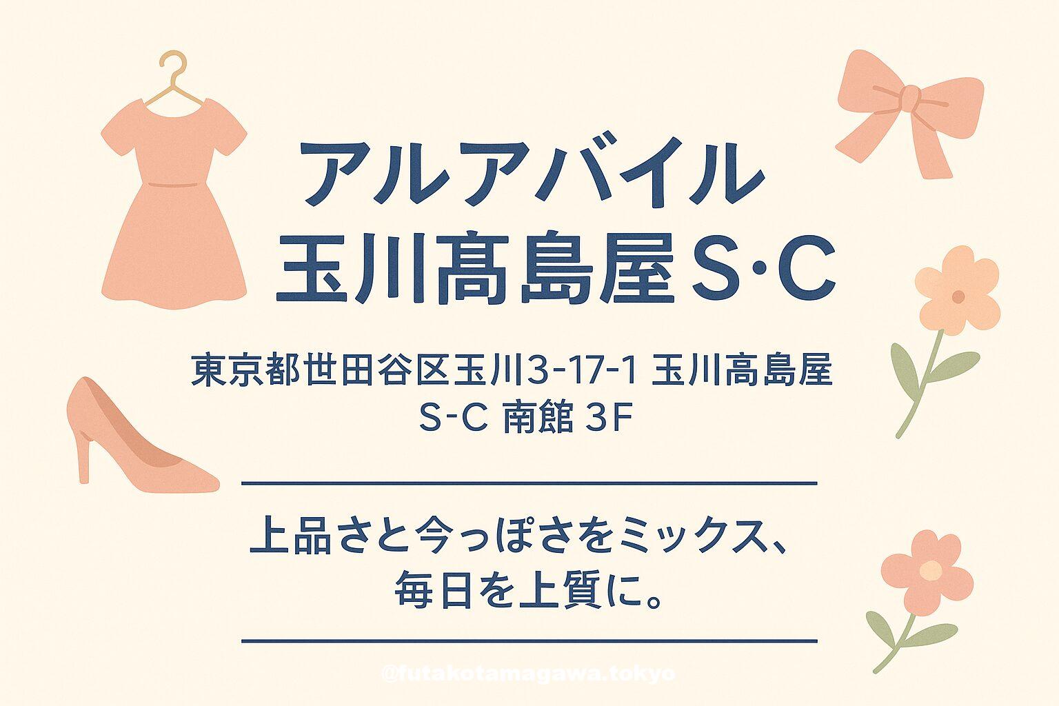 写真 ひとこと紹介文 上品さと今っぽさを“REFINED STYLE MIX”で。アルアバイル 玉川髙島屋S・Cは、南館3Fで10:00–20:00。オンも週末も映える名品が揃います。takashimaya.co.jp+1 地図 AI紹介文(ChatGPT5編) 洗練と可憐、その両方を欲張りたい日に寄りたいのが「アルアバイル 玉川髙島屋S・C」。南館3F・営業時間10:00~20:00・TEL 03-6431-0059という基本情報は施設公式に明記。駅直結の動線で、買い回りの合間にも立ち寄りやすい立地です ...