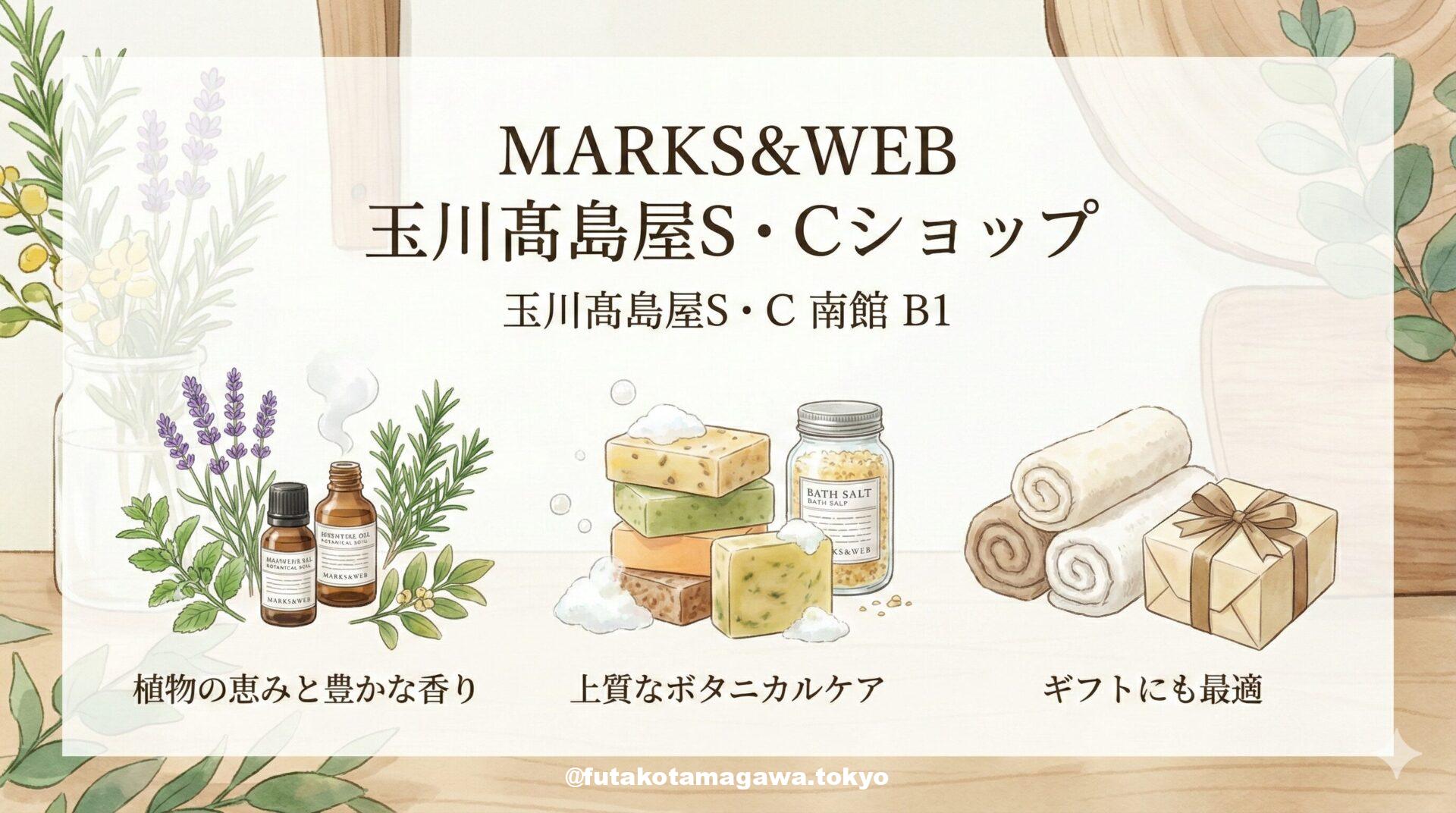 写真 ひとこと紹介文 二子玉川でのギフト選びや自分へのご褒美に。植物の恵みを生かした「MARKS&WEB」は、香り豊かなボタニカルケアアイテムが豊富。心地よい暮らしを提案する、玉川髙島屋S・C店の魅力とおすすめアイテムをご紹介します。 地図 AI紹介文(Gemini3編) 【二子玉川】毎日の暮らしに香りの彩りを。「MARKS&WEB」で見つける上質なボタニカルライフ 多摩川の豊かな自然と都市の利便性が調和する街、二子玉川。ショッピングや散策で賑わうこの街のランドマーク、玉川髙島屋S・Cの南 ...