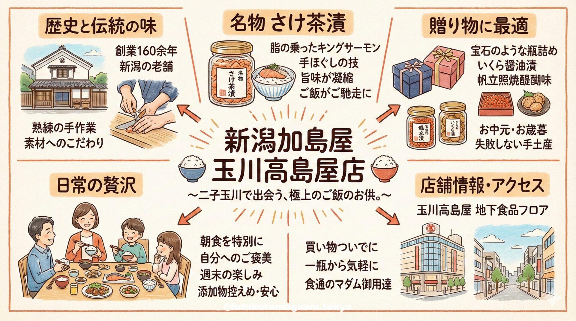 写真 ひとこと紹介文 二子玉川・玉川高島屋で長年愛される「新潟加島屋」。看板商品の「さけ茶漬」は、キングサーモンの脂と旨味が凝縮された極上の逸品です。日々の食卓を贅沢に彩るご飯のお供としてはもちろん、大切な方へ贈る「間違いのない手土産」としても絶大な支持を集めています。 地図 AI紹介文(Gemini3編) 【二子玉川】食通が指名買いする「新潟加島屋」の魔法。白いご飯がご馳走に変わる至福のひととき 二子玉川駅前の喧騒を抜け、玉川高島屋の地下食品フロアへ足を踏み入れると、ひときわ活気と品格を放つ一角がありま ...
