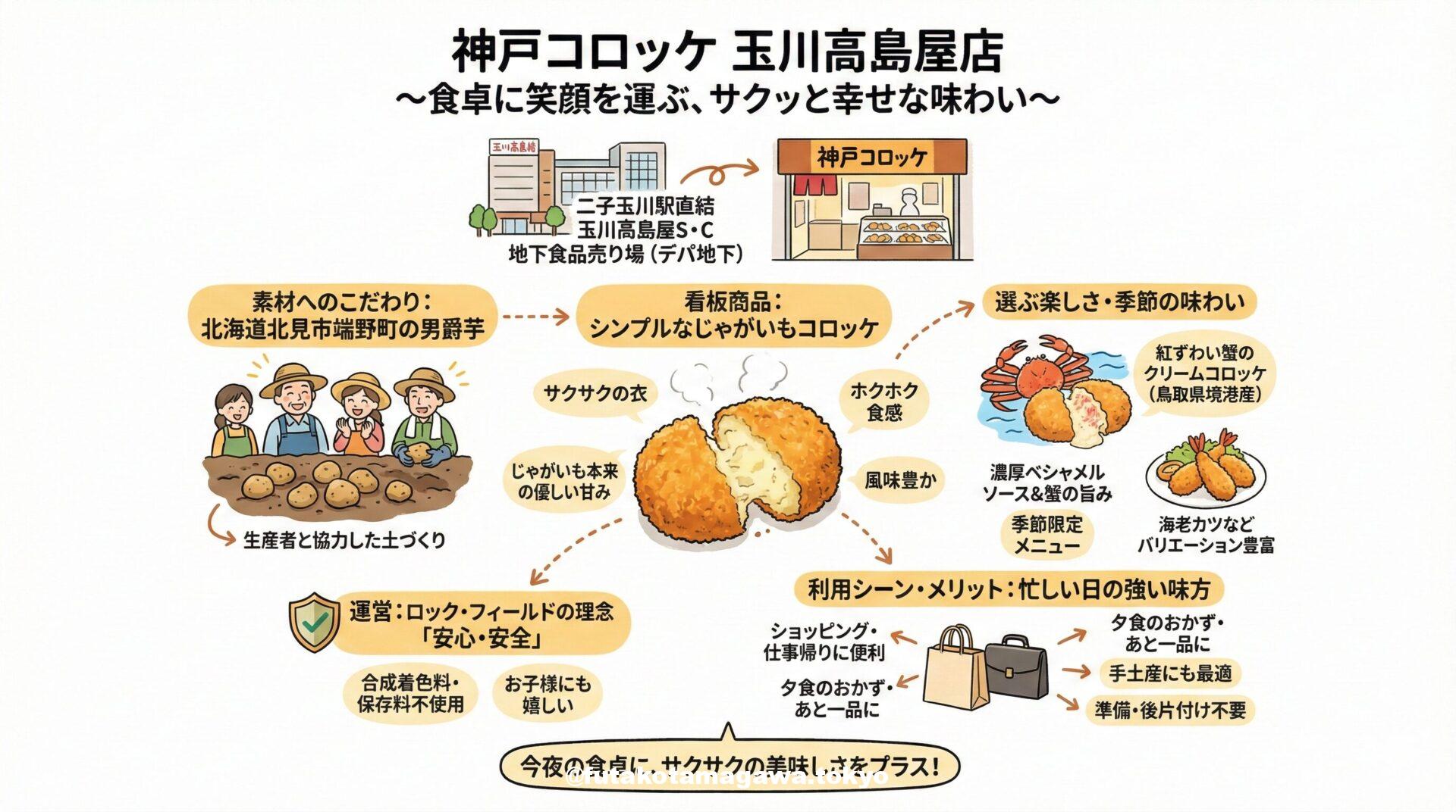 写真 ひとこと紹介文 二子玉川でのショッピング帰りに最適。「神戸コロッケ 玉川高島屋店」は、素材の旨みを活かした揚げたてコロッケが自慢です。北海道産じゃがいものホクホク感と、サクサクの衣が食卓を彩ります。今夜のおかずや手土産に、安心できる専門店の味をぜひ。 地図 AI紹介文(Gemini3編) 【二子玉川】食卓に笑顔を運ぶ、サクッと幸せな「神戸コロッケ」の魅力 二子玉川駅直結、玉川高島屋S・Cの地下食品売り場(デパ地下)。数多くの名店がひしめくこの場所で、長年愛され続けているのが**「神戸コロッケ 玉川高 ...