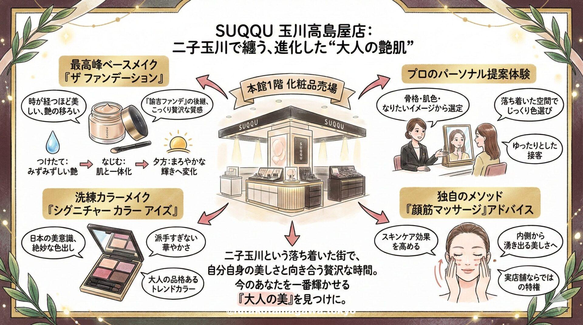 写真 ひとこと紹介文 二子玉川で「大人の旬」を纏うならSUQQU 玉川高島屋へ。名品「ザ ファンデーション」が叶える圧倒的な艶肌と、洗練されたカラーメイクが、あなたの個性を美しく引き立てます。本館1階の落ち着いたカウンターで、プロによる丁寧な色選びと感動の美体験を。 地図 AI紹介文(Gemini3編) 【二子玉川】進化した“大人の艶肌”を纏う。SUQQU 玉川高島屋で出会う、新しい私 二子玉川駅西口からすぐ、玉川高島屋S・C。洗練されたライフスタイルが集まるこの場所で、ひときわ静謐で上質な空気を放つコス ...