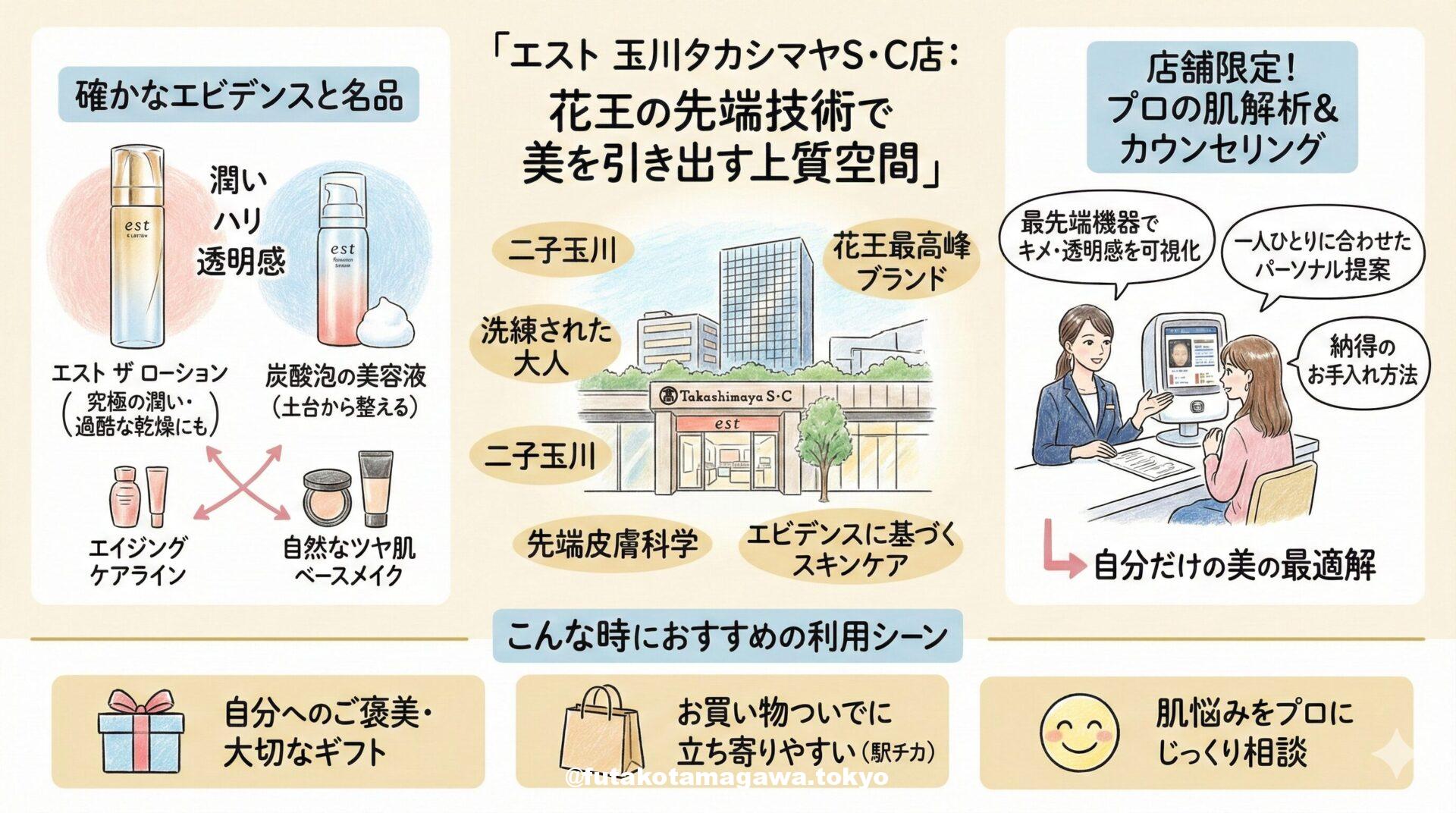写真 ひとこと紹介文 二子玉川駅すぐ、玉川高島屋本館1階の「SHISEIDOショップ」。最新機器によるパーソナルな肌測定と丁寧なカウンセリングで、あなたに最適なスキンケアやメイクをご提案します。洗練された空間で、自分だけの美しさを引き出す至福のひとときをご体験ください。 地図 AI紹介文(Gemini3編) 二子玉川で自分だけの美しさに出会う。玉川高島屋「SHISEIDOショップ」で極上のビューティー体験を 洗練された大人の街、二子玉川。ショッピングやグルメを楽しむ人々で賑わうこの街のランドマーク「玉川高 ...