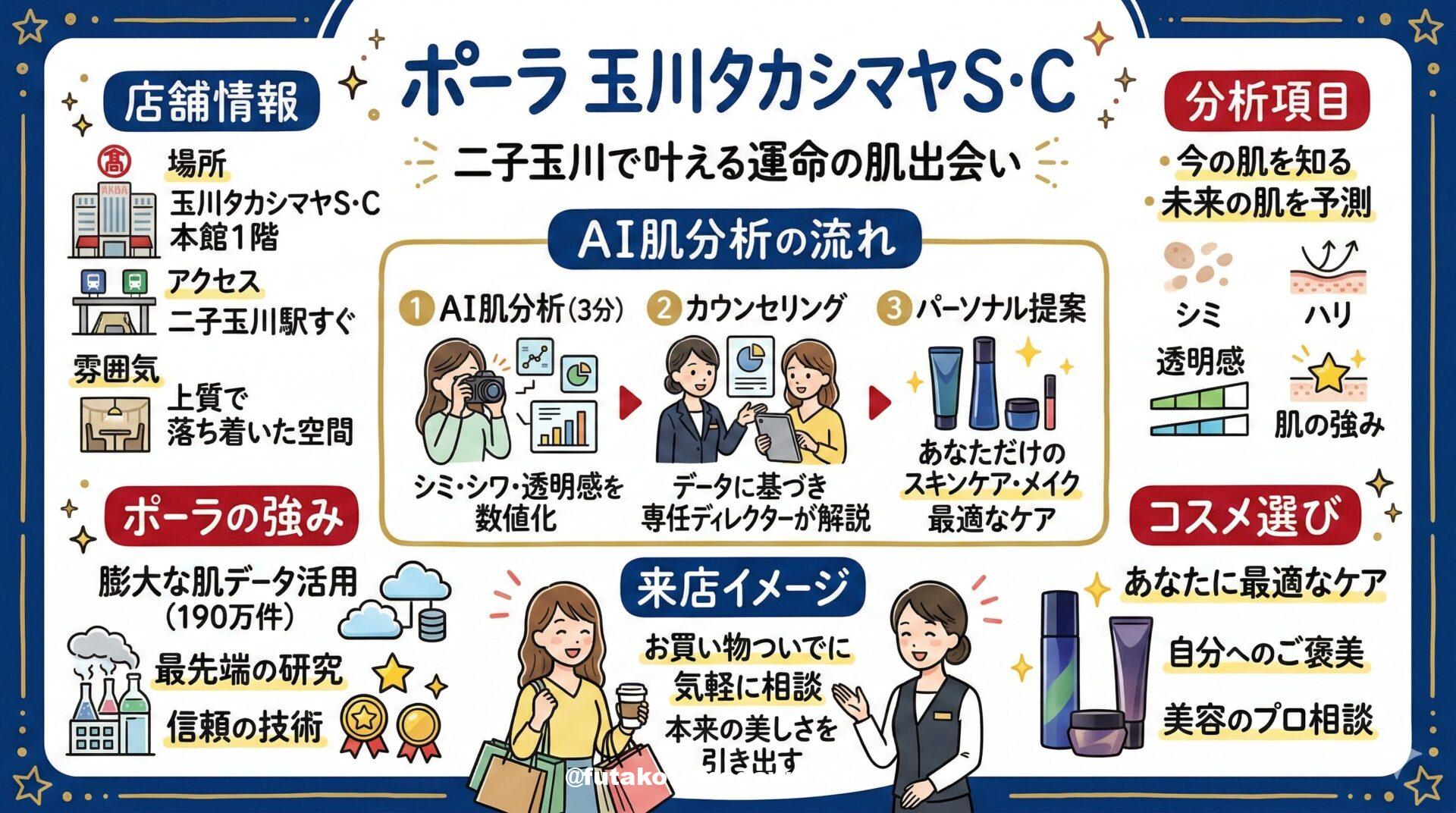写真 ひとこと紹介文 二子玉川で「大人の旬」を纏うならSUQQU 玉川高島屋へ。名品「ザ ファンデーション」が叶える圧倒的な艶肌と、洗練されたカラーメイクが、あなたの個性を美しく引き立てます。本館1階の落ち着いたカウンターで、プロによる丁寧な色選びと感動の美体験を。 地図 AI紹介文(Gemini3編) 【二子玉川】進化した“大人の艶肌”を纏う。SUQQU 玉川高島屋で出会う、新しい私 二子玉川駅西口からすぐ、玉川高島屋S・C。洗練されたライフスタイルが集まるこの場所で、ひときわ静謐で上質な空気を放つコス ...