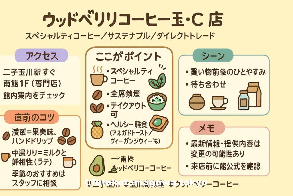 フリーキーワード | 玉川高島屋S.C.南館1FのWOODBERRY COFFEEは、サステナブルに向き合うロースター直営のカフェ。スペシャルティコーヒーを中心に、アボカドトーストやヴィーガン対応スイーツなど体にやさしい軽食も。全席禁煙で、買い物の合間や待ち合わせに最適。最新の営業時間は館公式をチェックして、二子玉川の日常に“上質な一杯”を。 |